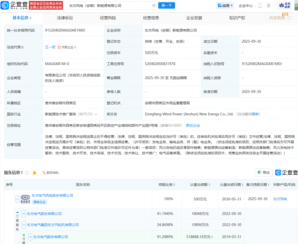 近日,东方风电(安顺)新能源有限公司成立,法定代表人为王一哲,经营范围包含:发电业务、输电业务、供(配)电业务;风力发电机组及零部件销售;新能源原动设备制造等。企查查股权穿透显示,该公司由东方电气(600875)旗下东方电气风电股份有限公司全资持股。